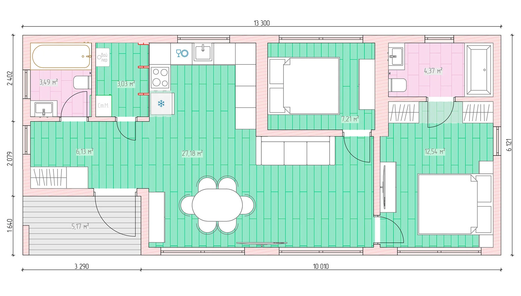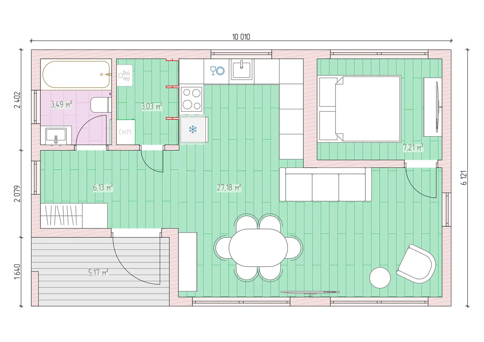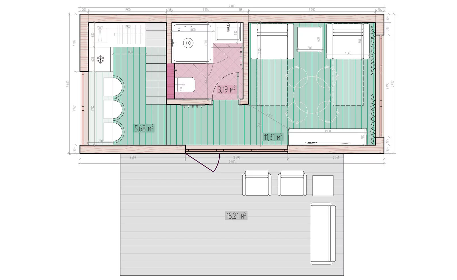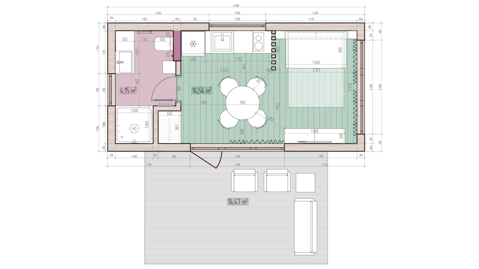 • Модульный дом строится на основе деревянного каркаса, обладающего высокой прочностью и надежностью. Этот метод строительства позволяет значительно сократить сроки возведения и обеспечивает возможность дополнительной экономии на отоплении и кондиционировании.